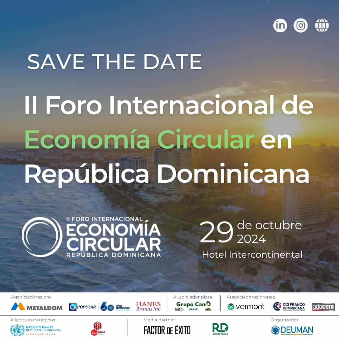 Santo Domingo, R.D. La Segunda Edición del Foro Internacional de Economía Circular en República Dominicana se celebrará el 29 de octubre de 2024 en el Hotel Intercontinental de Santo Domingo, consolidándose como el principal evento para fomentar la transición circular en el país. Este foro reunirá a líderes del sector público y privado, creando un espacio de intercambio y colaboración que busca impulsar la economía circular y las inversiones verdes en el ecosistema empresarial dominicano.