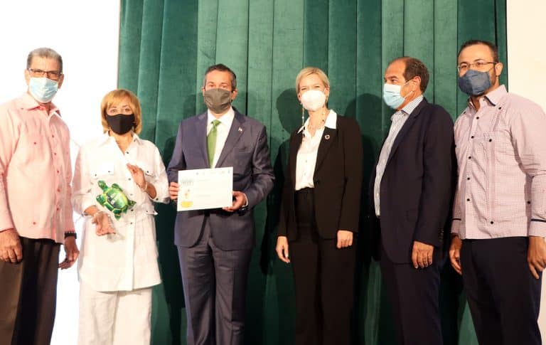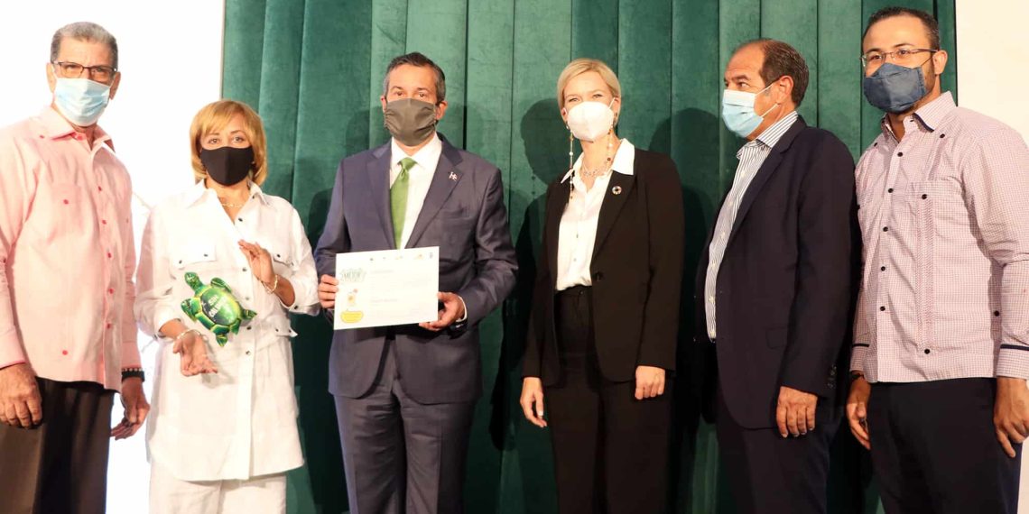 Santo Domingo. Empresarios turísticos y gastronómicos de las provincias de Samaná y Montecristi que participan de la iniciativa “Mejor sin calimete”, fueron reconocidos por el Ministro de Medio Ambiente, Orlando Jorge Mera y la representante residente del Programa de las Naciones Unidas para el Desarrollo (PNUD), Inka Mattila, por su compromiso voluntario de reducir y/o eliminar el plástico de un solo uso.